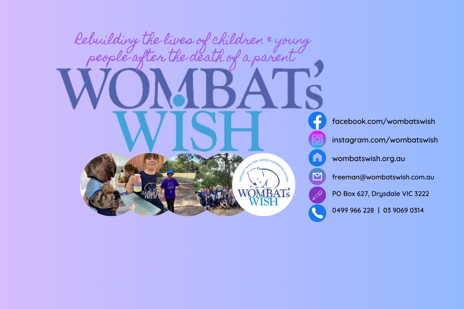 We are a grassroots local charity. All donations go towards Wombat's Wish programs that help parentally bereaved children across Victoria, when they need it most.